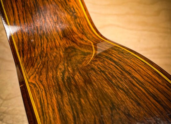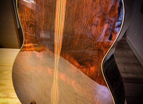 Denne Levin C7 er et smukt bevaret eksempel på det svenske håndværk, der kendetegnede Levins guldalder. Guitaren er bygget med en dæk i alpegran kombineret med valnød i ryg og sider, hvilket giver en raffineret og velafbalanceret tone med fremragende projektion og klarhed.