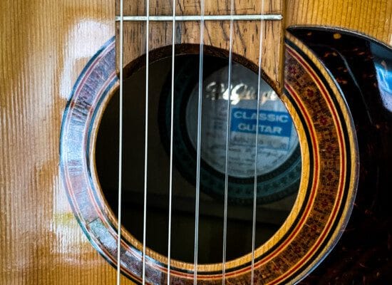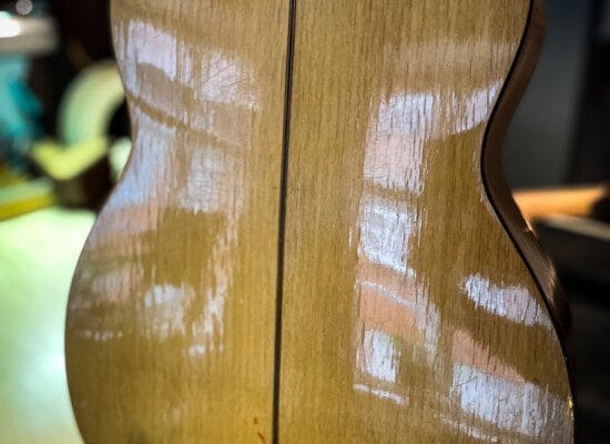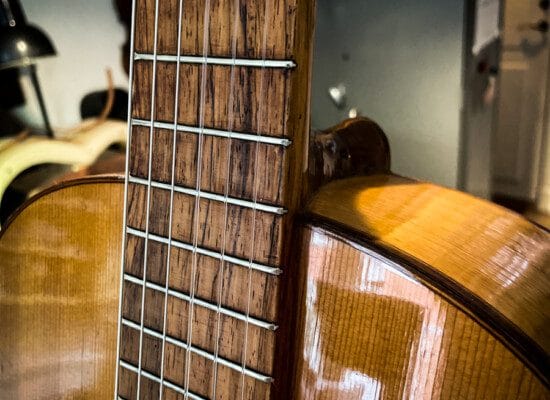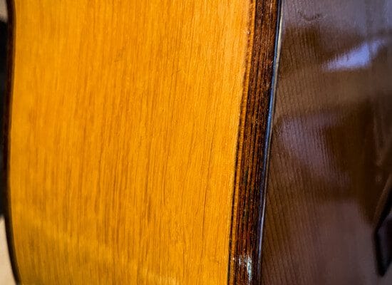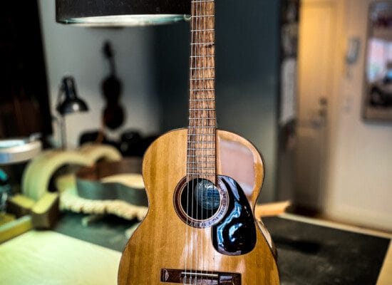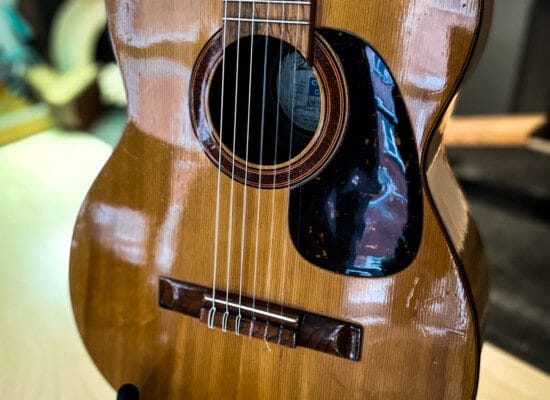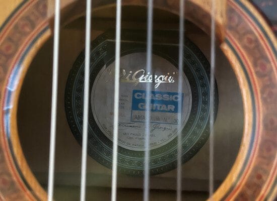 Denne brasilianske Di Giorgi Amazonia fra 1974 er en del af værkstedets private samling og er bygget med et dæk af Oregon Pine og med sider og bund i træsorten Pau-marfim, som ofte kan være næsten citronfarvet. Halsen er i cedertræ med gribebræt i ualmindelig lys palisander. Lyder er ikke kraftig, men varm og “cremet” og man forstår Bossanova-guitaristernes tiltrækning til Di Giorgio. Guitaren er belagt med et tyndt lag nitrocelleloselak som med årene har fået den autentiske og smukke overflade med de små karakteristiske krakeleringer.