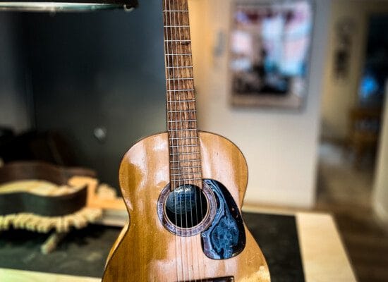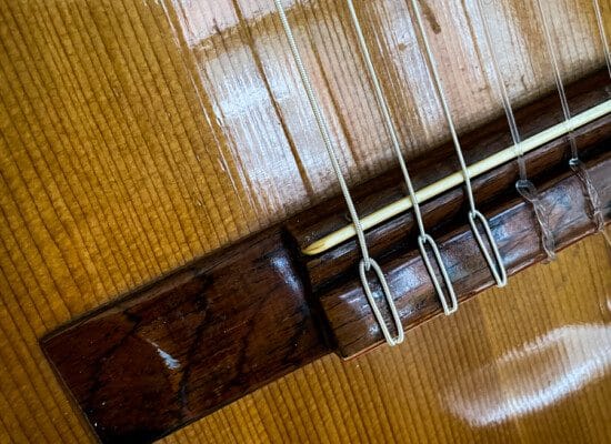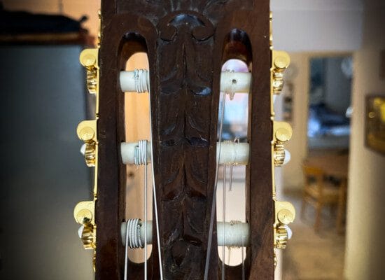 Guitaren er netop blevet nænsomt restaureret. Den har fået nye stemmeskruer og et par spander er limet til igen. En ny saddel i rådyrgevir er tilvirket, da den gamle i plastik ikke ydede guitaren retfærdighed.