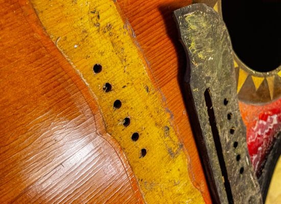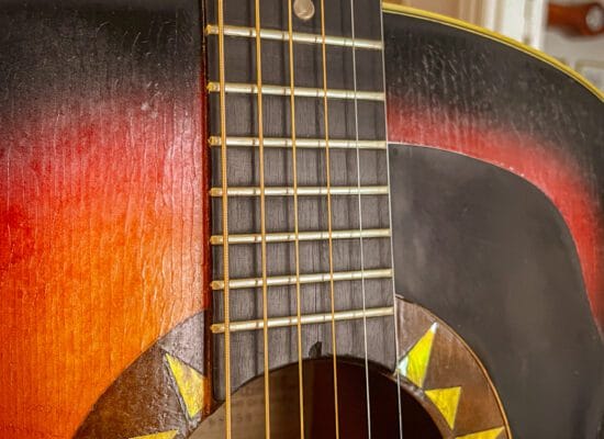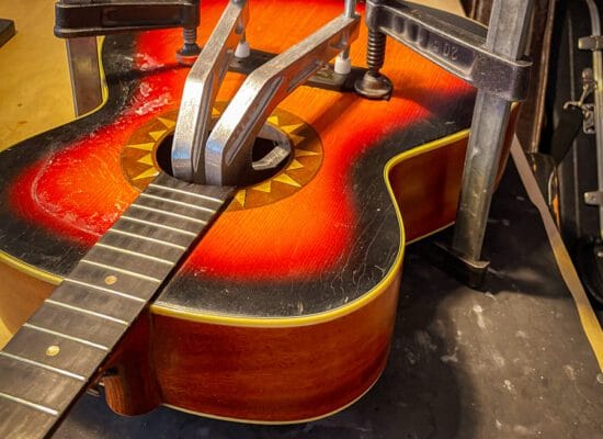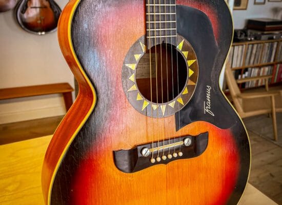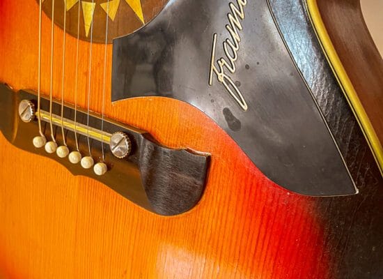 Denne Framus led af typiske aldersproblemer som ses på akustiske guitarer: en løsrevet bro, en slagplade, som med tiden har antaget en form som en frugtskål og revner i dæk og sider. Sidstnævnte i dette tilfælde, grundet slagskader og ikke som typisk udtørring.