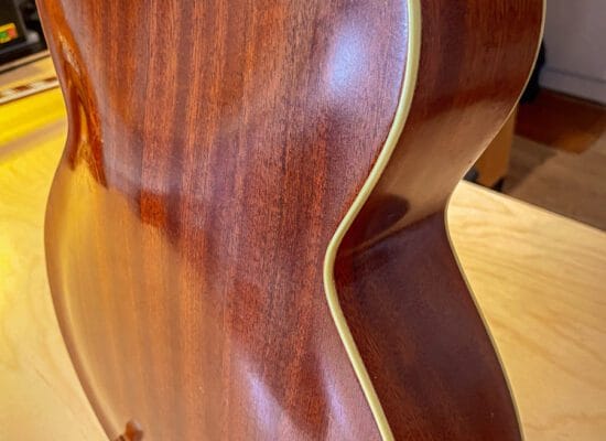 Ejeren af denne guitar ville gerne have genskabt lidt af den originale finish, som med tiden har fået mange dybe krakeleringer, som er helt karakteristiske ved overflader behandlet med nitrocelluloselak. De fleste ynder denne patinering, men i dette tilfælde var det meget kraftige krakeleringer. Man kan få den gamle lak til at flyde lidt sammen ved at påsprøjte flere meget tynde lag ny celluloselak. Den nye lak opløser den gamle og overfladerne løber lidt sammen. Ikke helt heldigvis, så foryngelsen er kun begrænset. I dette tilfælde lykkes det fint: guitaren har stadig masser af patina.
