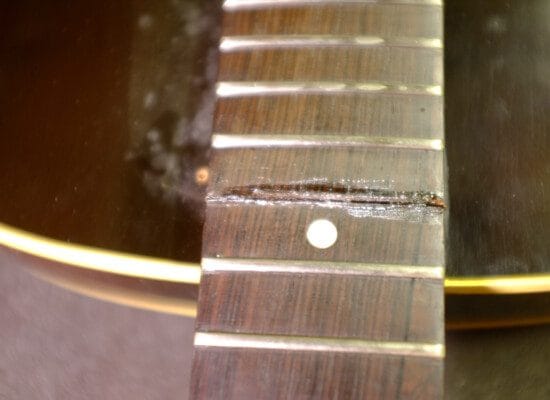 Et par skruetvinger, nogle spændeklodser og opvarmet lim færdiggjorde reparationen. Tilbage er en opstrengning og en grundig justering af strengehøjde og intonation og den næsten 60 årige guitar er klar til at komme tilbage på landevejen med bluesorkestret.