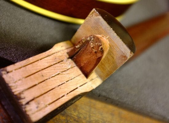 Afmonteringen af halsen er altid en besværlig og lidt nervepirrende proces. Efter indledende prøvemonteringer hvor gentagne slibninger og arbejde med skarpt stemmejern slutter det altid med, at jeg trækker sandpapir gennem fladerne i samlingen for at tilpasse pasformen perfekt til den buede overflade.