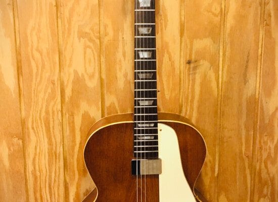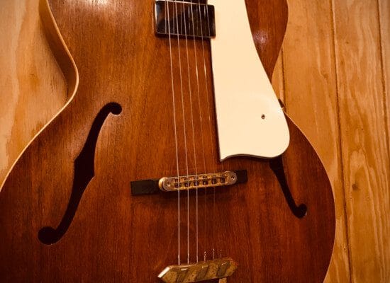 Modellen kom i flere trækombinationer, denne er mahogni på toppen og hele vejen rundt. Den har oprindeligt været lakeret i Sunburst finsh. “Tailpiece” og stol er ikke de oprindelige, men den spiller fantastisk, hurtig og let og vil helt sikkert overleve de fleste af os dødelige.
