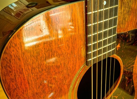 Denne D25 den tidlige, og mere ikoniske model med mahognidæk, bagside og sider. Mere end noget andet, adskiller mahognidækket guitaren lydmæssigt fra den senere model med grandæk, idet mahognimodellen har en kraftigere og mere “pågående” lyd.