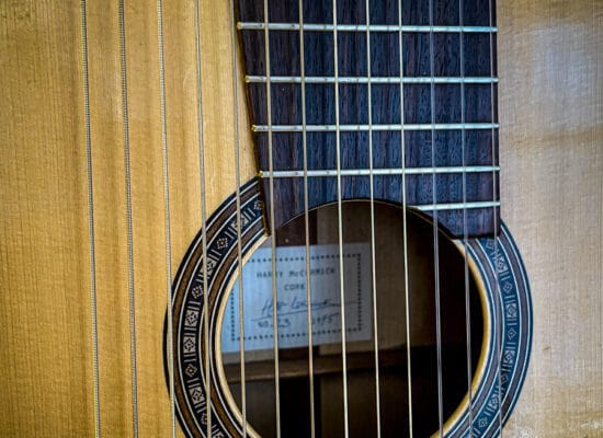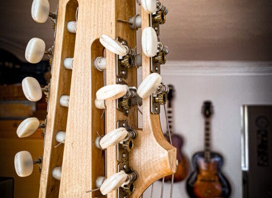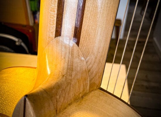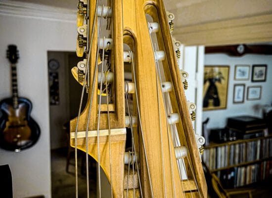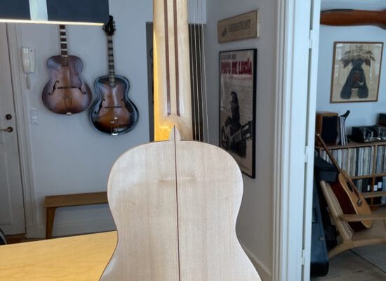 På værkstedsbordet ligger der her en imponerende version af instrumenttypen, bygget af Harry McCormick i 1995 og venter på lidt service og lakarbejde.
