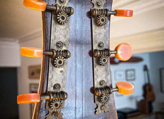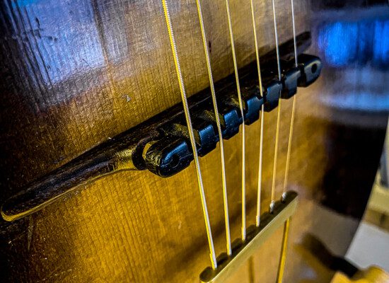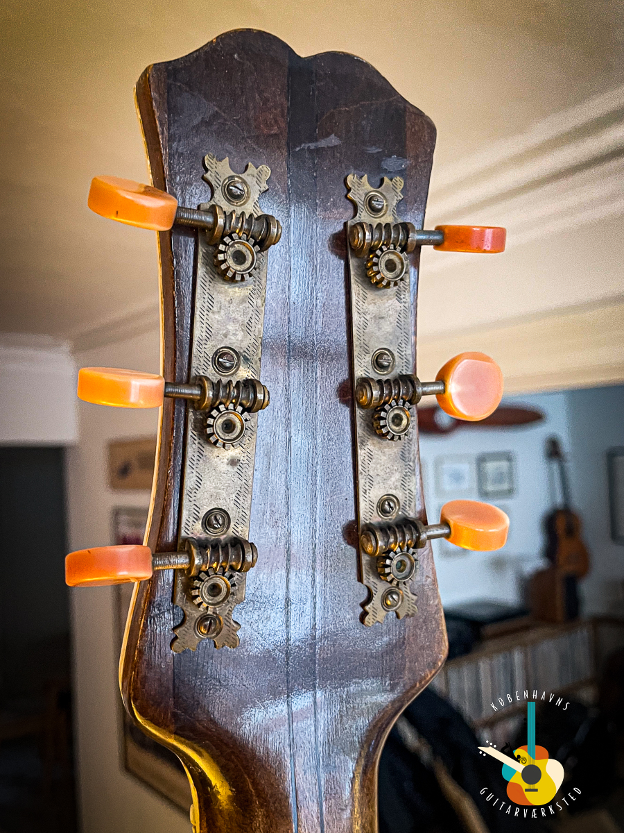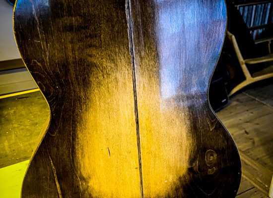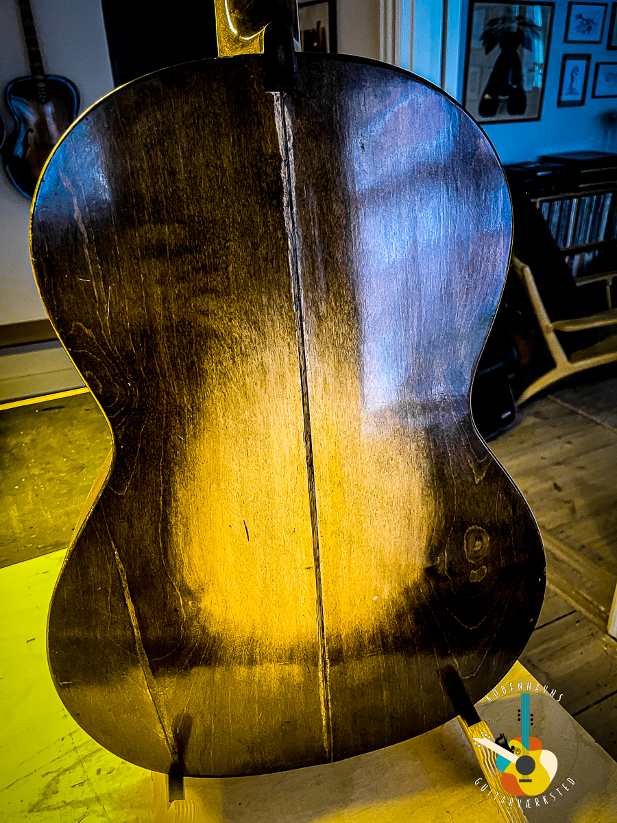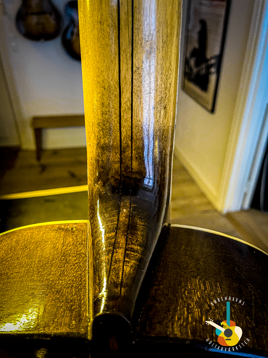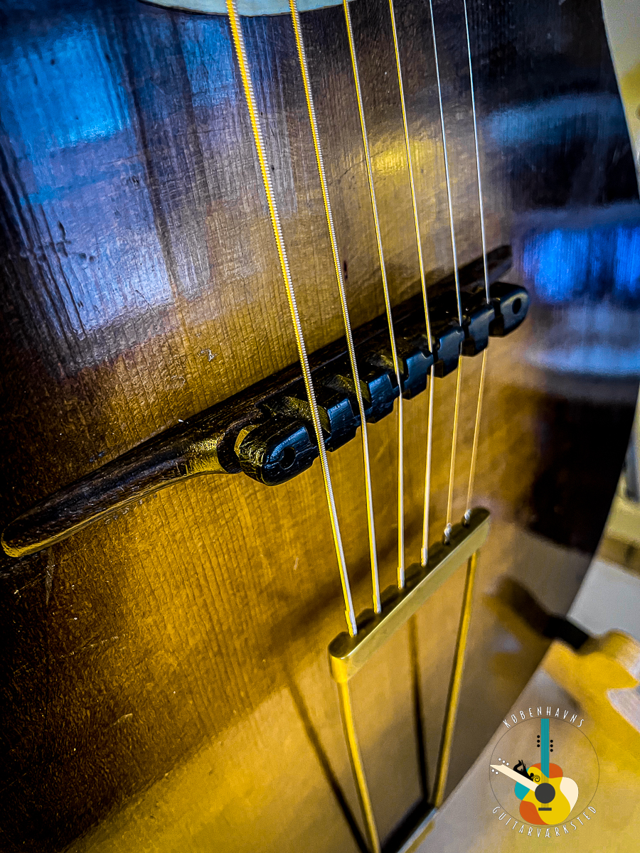 På værkstedet har jeg lavet revner i dæk og slibning, kroning og polering af bånd, samt arbejdet med stolen, så den passer bedre til dækket og justeret strengehøjde for optimal spilbarhed som passer til kundens ønsker og spilleteknik.