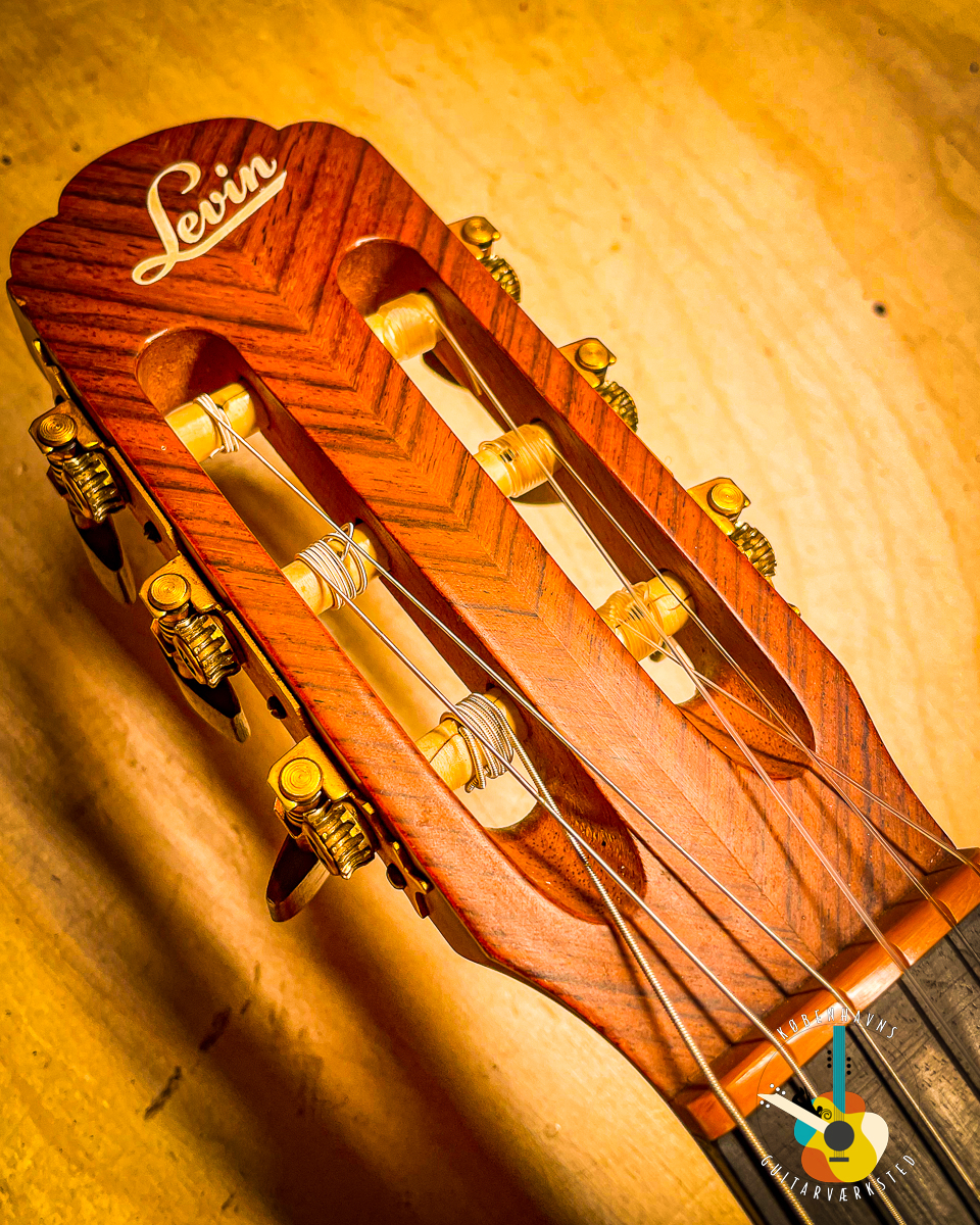 Denne Levin C7 er et smukt bevaret eksempel på det svenske håndværk, der kendetegnede Levins guldalder. Guitaren er bygget med en dæk i alpegran kombineret med valnød i ryg og sider, hvilket giver en raffineret og velafbalanceret tone med fremragende projektion og klarhed. Dens mahognihals har Levins klassiske ikke-justerbare U-formede stålstang inbygget, og er udstyret med ibenholt gribebræt samt palisanderstol. De originale guldbelagte Van Gent mekanikker med knapper i palisander fuldender instrumentets elegante udtryk.