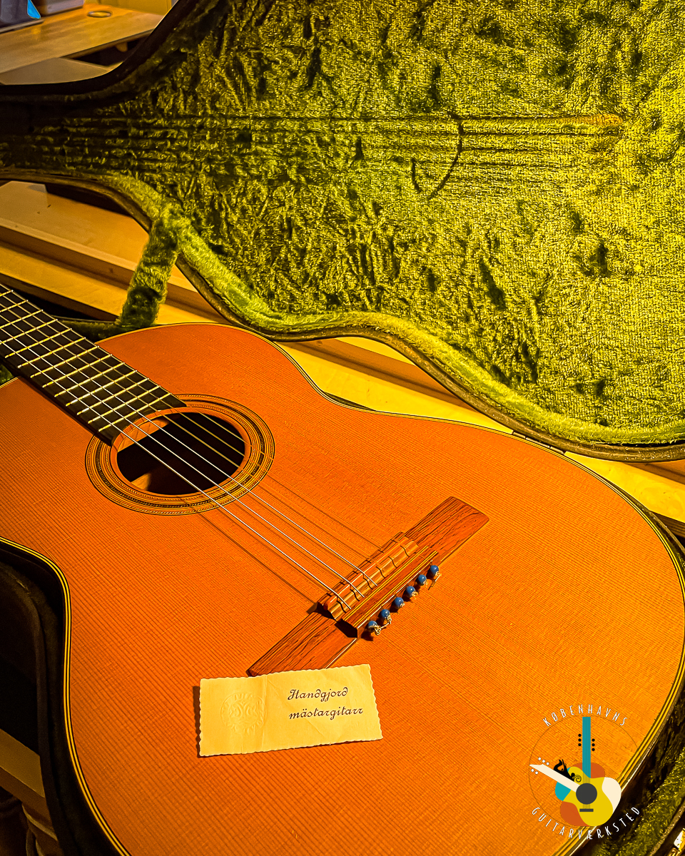 Inside the lid is the original Swedish description: “Handgjord mästargitarr” – meaning “Handmade master guitar.”