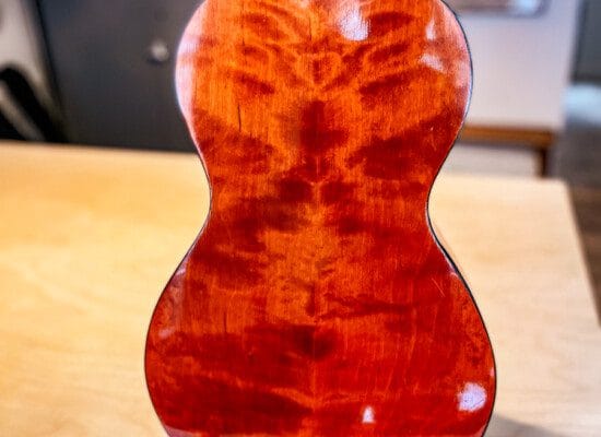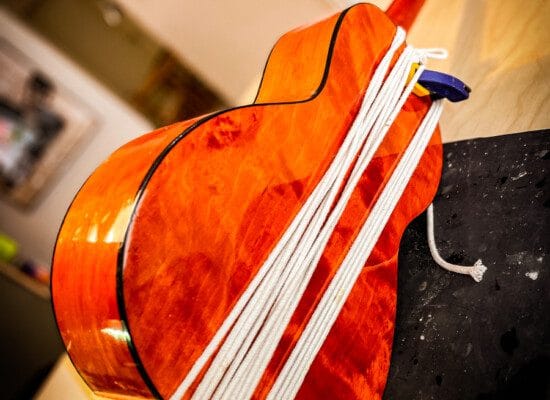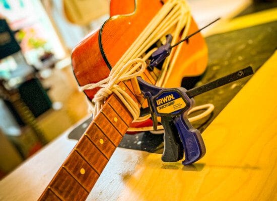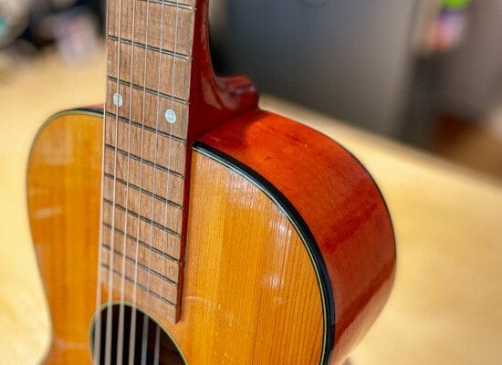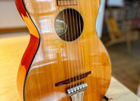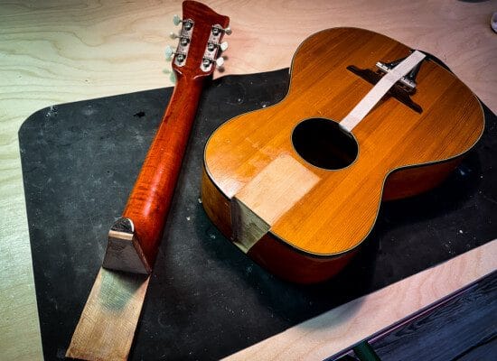 På denne lille lette parlourguitar holdt den gamle limning ikke længere. Den blev rengjort grundigt for gammel lim og den fik en kærlig hånd med et skarpt stemmejern og sidst en lun benlim.