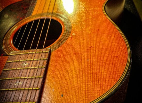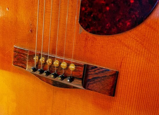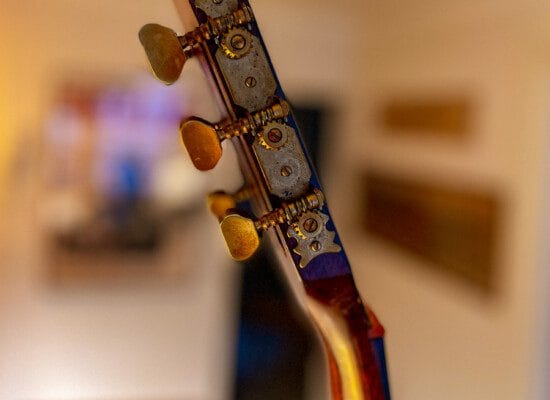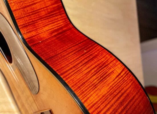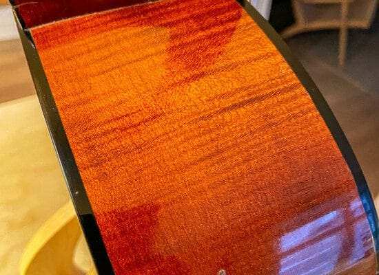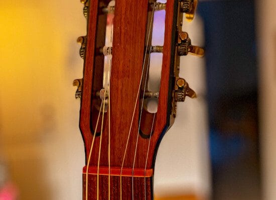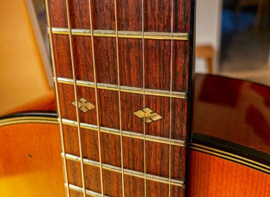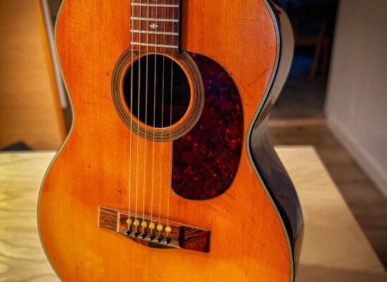 Den har nu fået limet et par afstivninger, renoveret stemmeskruer, skiftet bånd og renset gammel lak og til slut en meget nænsom og let polering, så den mest ligner det den er: et velbevaret gammelt instrument med masser af spilleglæde, fremfor en helt nylakeret guitar med en lidt fortabt sjæl.