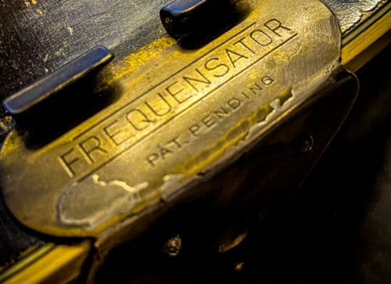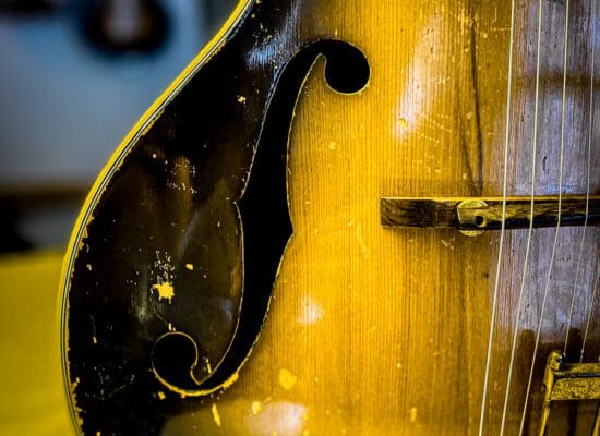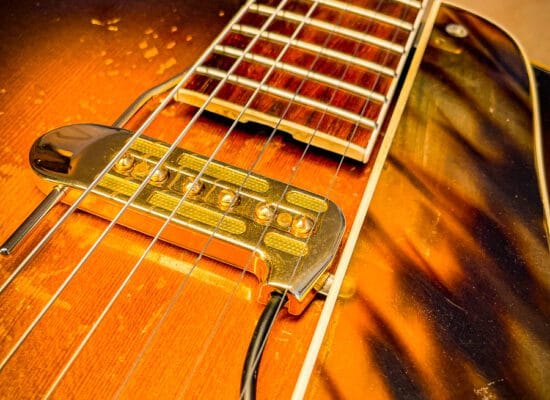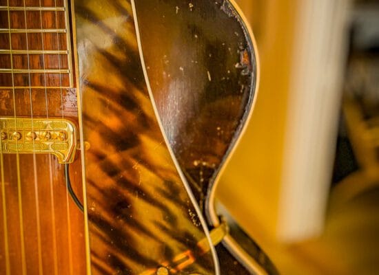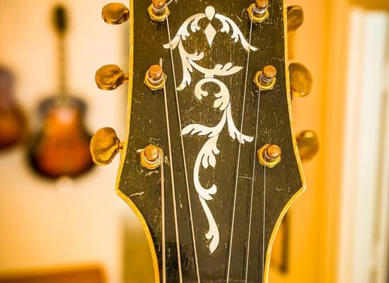 Epiphone Broadway var en “professionel” archtop-model bygget fra begyndelsen af 1930’erne og frem. Modeltypenavnet betyder at guitaren er hul, akustisk eller semi-akustisk, med en krop med den karakteristiske buet (“arch” på engelsk) dækplade, Guitarens lyd blev særlig populær blandt jazz- og bluesmusikere. Dengang var mærket synonym med mesterbyggede instrumenter af høj kvalitet, helt modsat mærkets nutidige rolle. Broadway-modellen ændrede sig betydeligt i løbet af dens produktionsperiode, og den version, der vises her, er fra 1939. Den har en krop af træsorterne valnød og gran, den måler 17,25″ på tværs og har en femlags lamineret hals med kantbindinger og store perlemorsindlæg i gribebrættet. Kroppen er pyntet med flerlagsbindinger og hovedstykket er asymmetriske og udsmykket overdådigt med vinmønstrede perleindlæg. Guitaren her har stadig de helt originale Grover Sta-Tite stemmeskruer i guldfinish, ligesom den også har strengeholderen med det herlige navn: Frequensator.