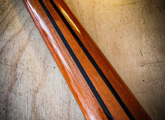 Lamineret hals i mahogni med lamineringer af ibenholt og gribebræt fremstillet af ibenholt.