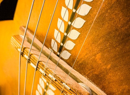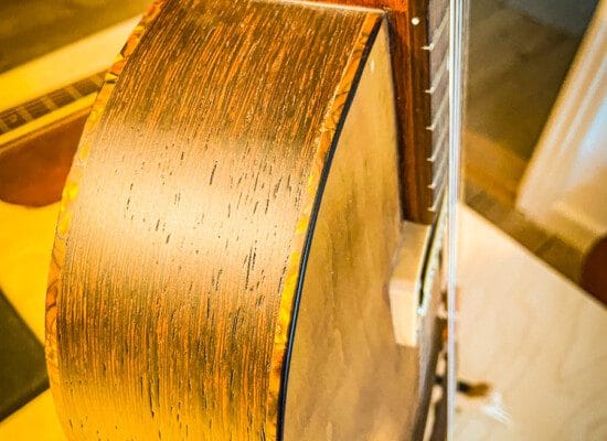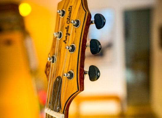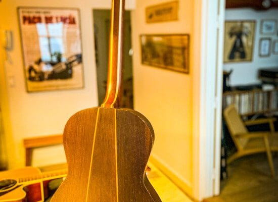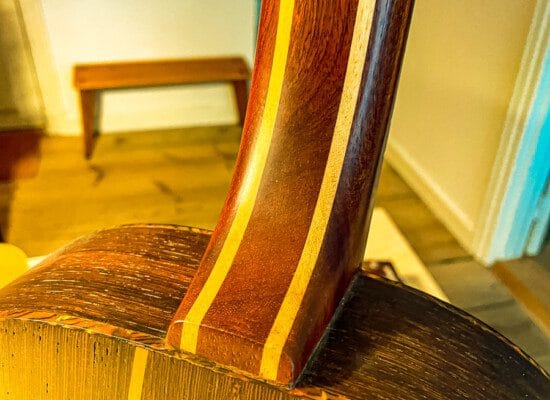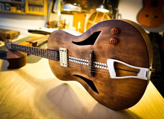 I denne fortolkning af den klassiske jazzguitar har Olivetti benyttet blandt andet valnød og pæretræ. Masser af dekorative detaljer og anderledes valg fra hans side.