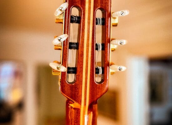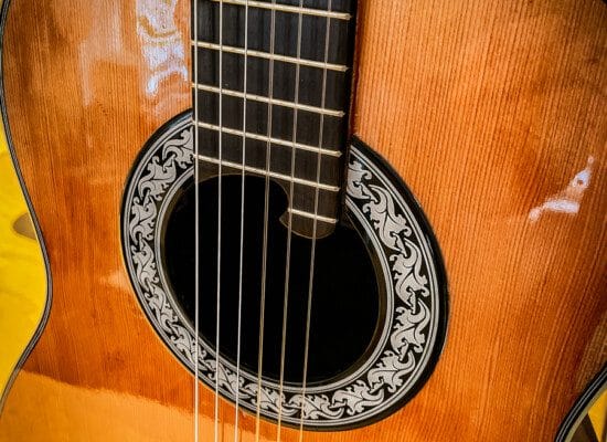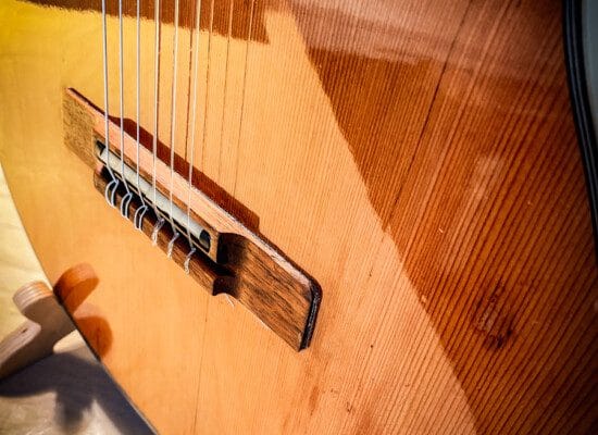 Denne nylonstrengede Ovation model 1613 har undergået en kæmpe renovering. Heldigvis findes der stadig musikere som vil gå langt for at have en velholdt gammel Ovation. Dækket var revnet voldsomt mange steder og kantbindingerne var knækket og havde sluppet limningerne flere steder. Dækket er nu blevet repareret, den tykke gamle polyesterlak fjernet. Ny 7-lags binding er lagt i kanten, en ny roset er fremskaffet og indfarvet i den rigtige kulør. Dækket har fået en glansfuld nitrocellulose lak med en afsluttende polering.