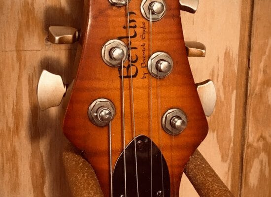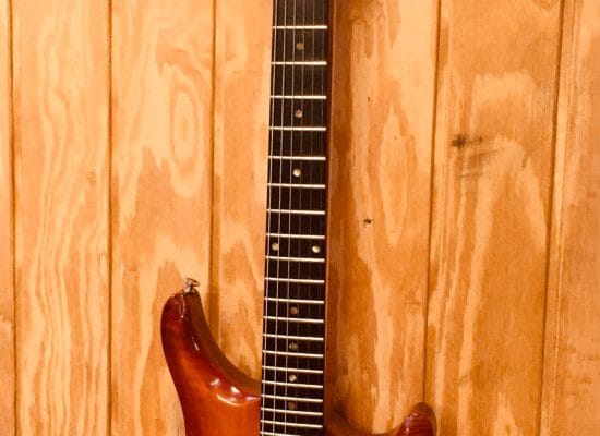 Én af dem er denne Berlin model fra 1990’erne lavet af brasiliansk mahogni bagpå og med et smukt stykke kontureret ahorn på toppen. Halsen er limet på kroppen og gribebrættet er kulsort ibenholt. Guitaren er serviceret i elektronikken, justeret og renset for mange års nikotinlag. Det er den laveste action jeg tror er muligt på en guitar og passer dens ejers ønske godt.