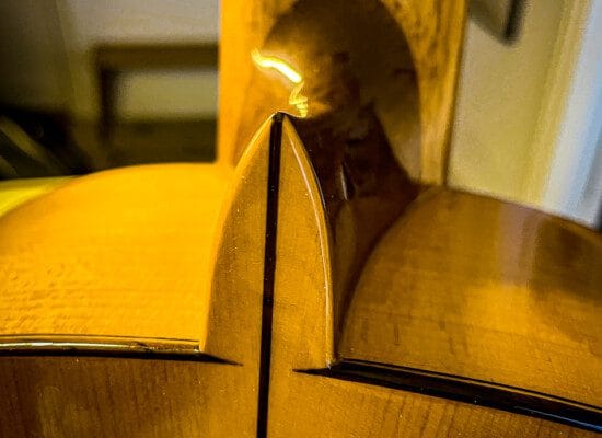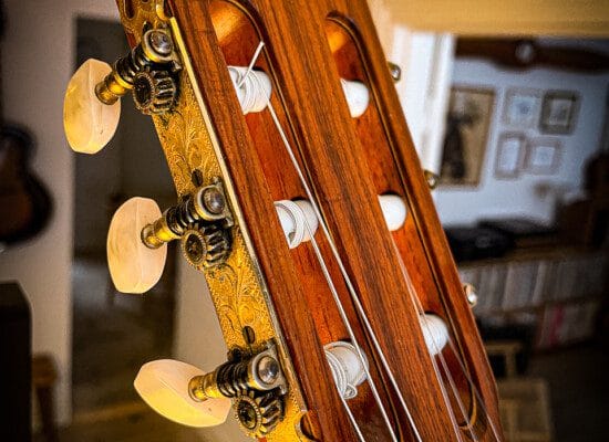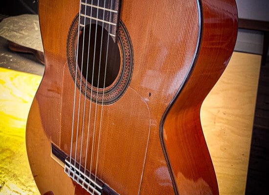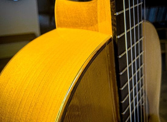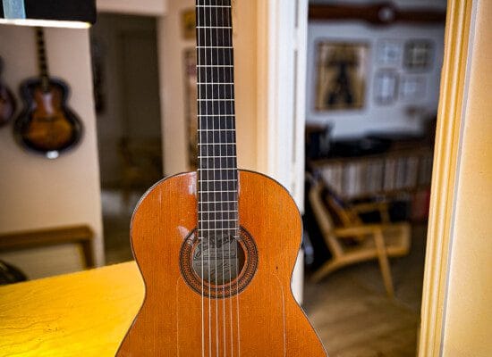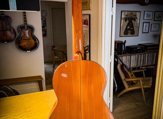 Denne guitar har været på værkstedet for reparation af revner i dæk, samt tilpasning af bånd i gribebræt. Strengehøjden måler ofte lidt lavere (omkring 3-4 mm over den 12. bånd på den lave E-streng og 2-3 mm på den høje E-streng) end de klassiske guitarer, ligesom stoleindlægget har en rampeformet line modsat 30 graders radio for klassiske indlæg.