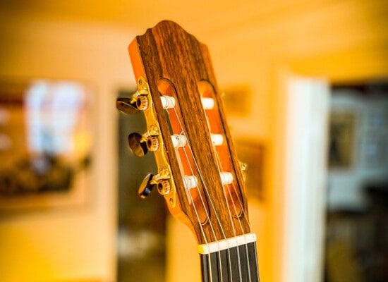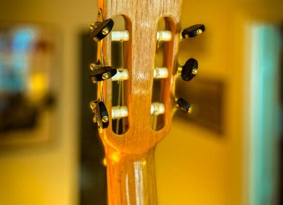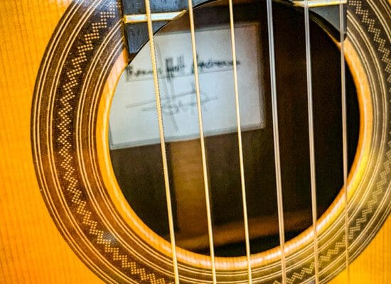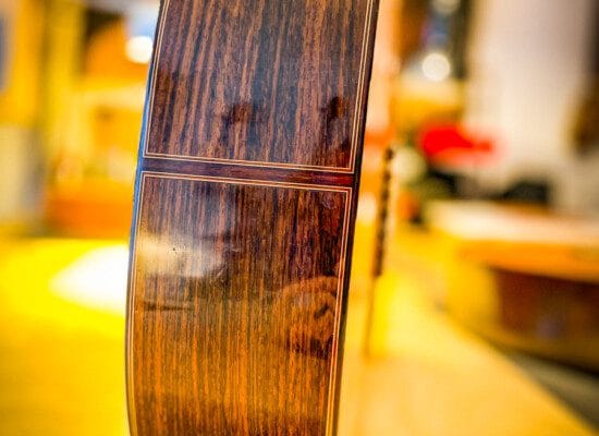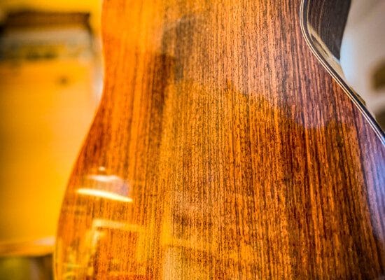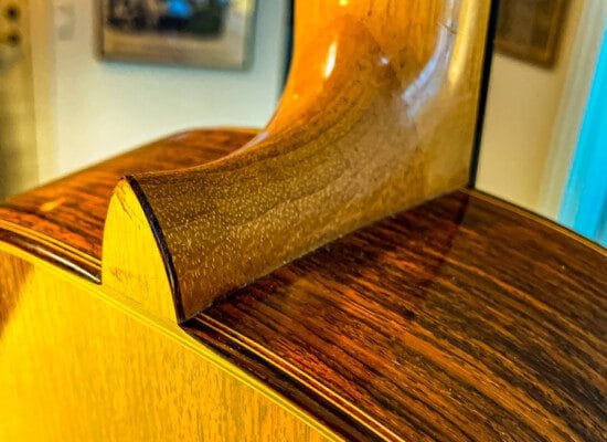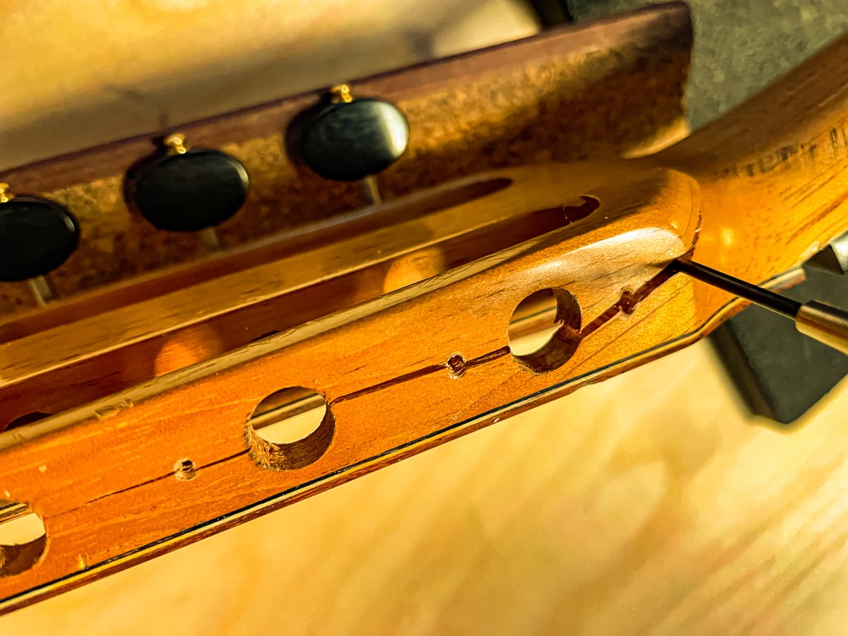 Denne guitar kom til værkstedet efter at have pådraget sig en revne omkring kulisserne til stemmeskruerne. Ikke nogen kompliceret reparation, men den efterfølgende finish er lidt tidskrævende, da den originale shellak skal genopbygges omkring skaden.